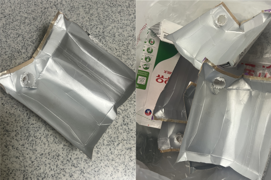 다음으로 살펴본 건 멸균우유팩이었다. 겉보기엔 종이팩과 비슷하지만, 만져보면 훨씬 단단하고 표면이 매끄럽다. 바로 멸균팩이라 불리는 복합재질 포장재이기 때문이다. 멸균팩은 종이 외에도 플라스틱과 알루미늄층이 겹겹이 붙은 구조로, 내용물을 장기간 신선하게 보존할 수 있다. 그러나 이러한 복합 구조 때문에 재활용은 훨씬 까다롭다. 멸균팩은 특수 설비를 통해 내부 알루미늄층을 분리해야만 재활용이 가능하며, 일반 종이류와 섞이면 전체 재활용 효율이 급격히 낮아진다.