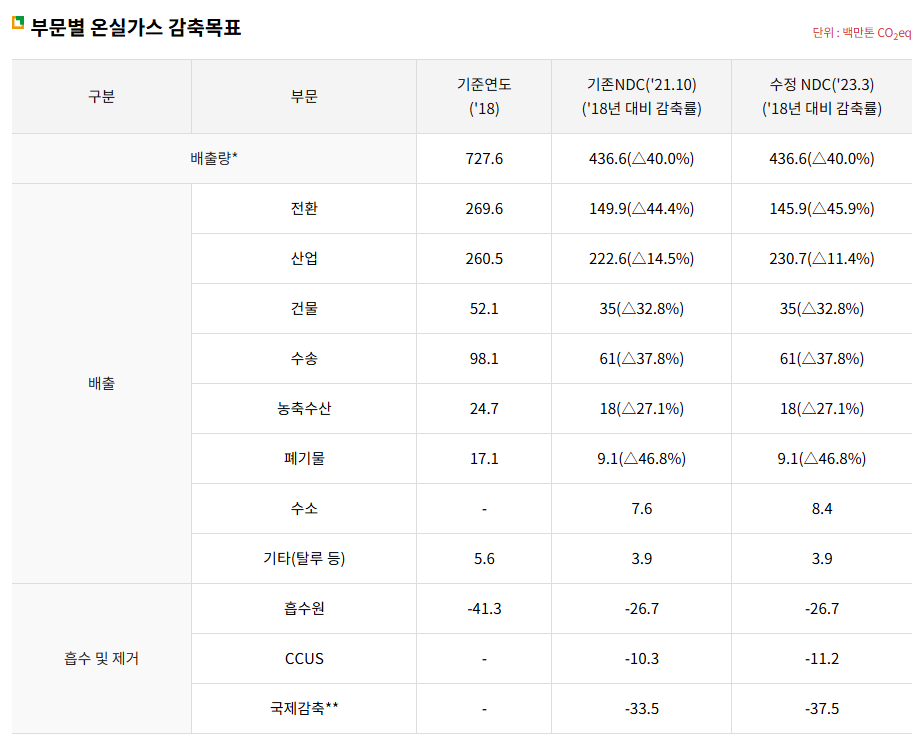 둘째는 이행 경로 설계입니다. 어떤 수치를 선택하든 전력 부문의 재생에너지 확대·석탄 조기폐지·전력망 유연성, 산업 부문의 전기화·수소 전환·공정 전환·CCUS에 대한 연차별 감축곡선, 수송·건물 부문의 보급 지표와 실제 감축톤수의 연계, 농축산·순환경제 부문의 메탄 저감과 바이오가스화·공동소화 확대, 흡수원 부문의 순흡수 확대화 MRV(측정·보고·검증) 강화 등을 계량 지표로 본문에 명시하여 국제 검증과 이행점검에 견딜 수 있도록 해야 합니다. 또한 파리협정 제 6조 국제탄소시장 활용 시에는 추가성, 이중계산 방지, 해외감축 상한 등 원칙을 명확히 할 필요가 있습니다.