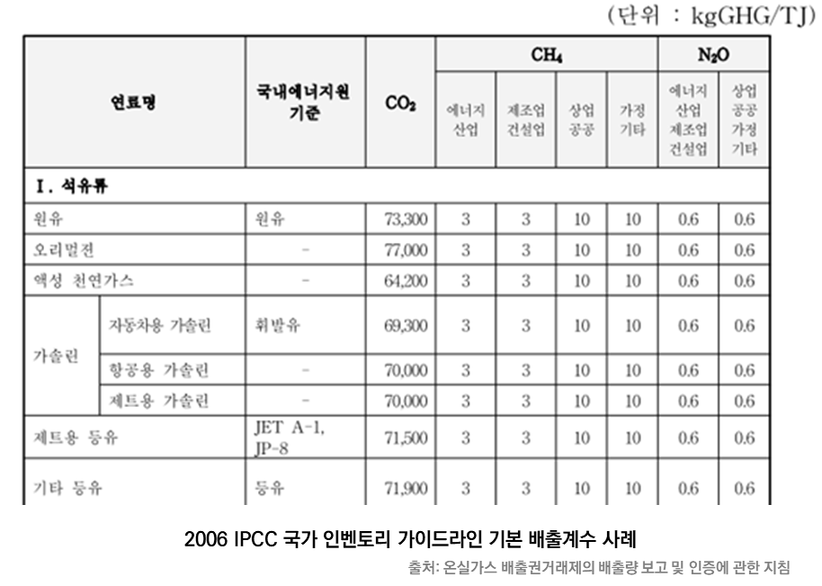 배출계수는 각 활동에 따라 온실가스 배출량이 얼마나 나오는지 그 단위 배출량을 미리 정해놓은 수를 말합니다. 공장에서 제품을 생산할 때 전기를 사용했다면 전력 배출계수를, 가스를 사용했다면 가스 배출계수를 사용해서 계산합니다. 만약 산정등급 Tier1에 따라 배출량을 산정한다면 IPCC의 기본 배출계수를 활용합니다.
