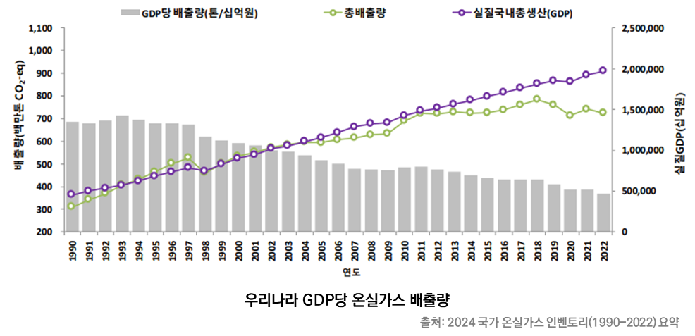 우리나라의 국가 온실가스 총배출량은 2018년 783.9백만톤이었던 것이 차츰 감소하여 2022년에는 724.3백만톤이 됐는데요, GDP는 증가하면서 배출량은 감소하는 추세를 보이고 있습니다.