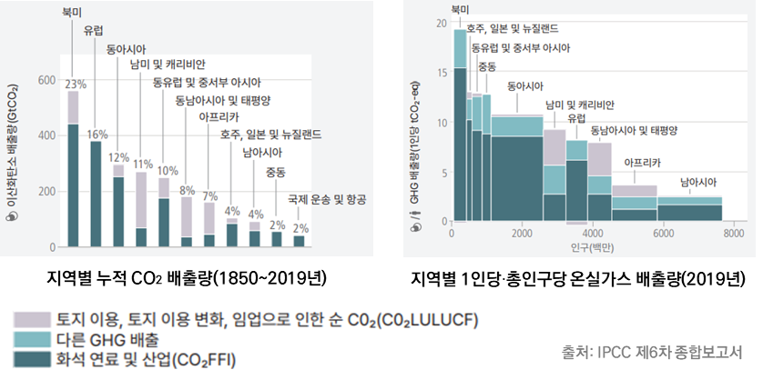 1850년 이후 온실가스는 전 지구적으로 배출됐지만, 그 양은 지역적으로 차이가 큽니다. 1인당 배출량 역시 마찬가지죠. 아래 그림 중 왼쪽은 1850~2019년까지 지역에 따른 이산화탄소 누적 배출량을 보여주는데, 북미와 유럽이 월등히 높다는 것을 알 수 있습니다. 오른쪽은 지역에 따른 2019년 한 해의 온실가스 배출량인데 세로축은 1인당 배출량으로 역시 북미가 제일 높습니다. 온난화의 책임은 지역에 따라 차이가 있는 겁니다.