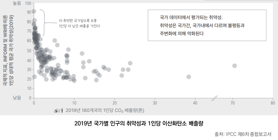 기후변화를 일으키는 온실가스 배출량과 1인당 배출량은 지역에 따라 차이가 큽니다. 북미와 유럽이 월등히 높죠. 그럼 기후변화로 인한 손실과 피해도 북미와 유럽이 클까요? 그렇지 않습니다. 기후변화에 대한 책임이 적은, 즉 온실가스를 적게 배출한 사람들이 기후변화로 인한 영향에 가장 취약합니다. 아래 그림은 2019년 국가별 1인당 이산화탄소 배출량과 취약성을 나타냅니다. 가로축은 1인당 이산화탄소 배출량이고 세로축은 취약성인데요, 배출량이 적은 국가가 취약성이 높고 반대로 배출량이 많은 국가가 취약성이 낮다는 것을 알 수 있습니다.