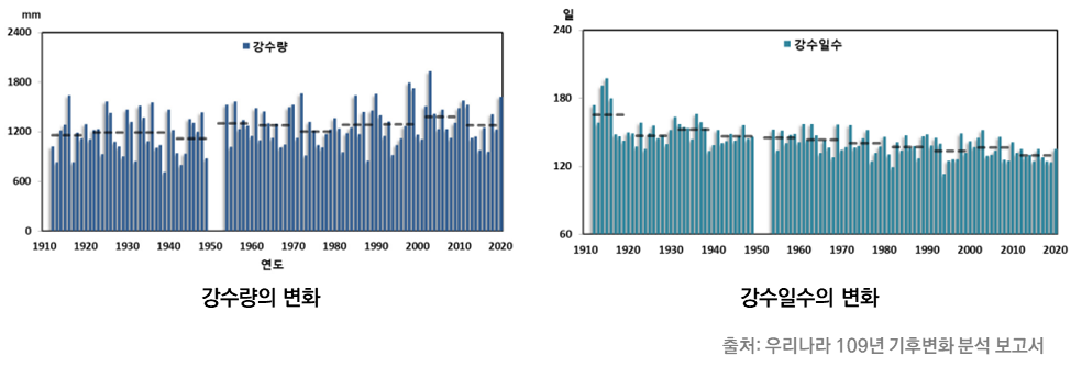 강수량은 어떨까요? 과거 30년(1912~1940년)에 비해 최근 30년(1991~2020년)에는 강수량이 135mm 증가한 것에 반해, 강수 일수는 21일 감소했습니다. 특히 여름철 강수량이 크게 증가했는데요, 비 오는 날은 적은데 비의 양이 많아졌다는 건, 비가 골고루 안 오고 특정한 시기에 집중해서 내렸다는 것을 의미합니다.