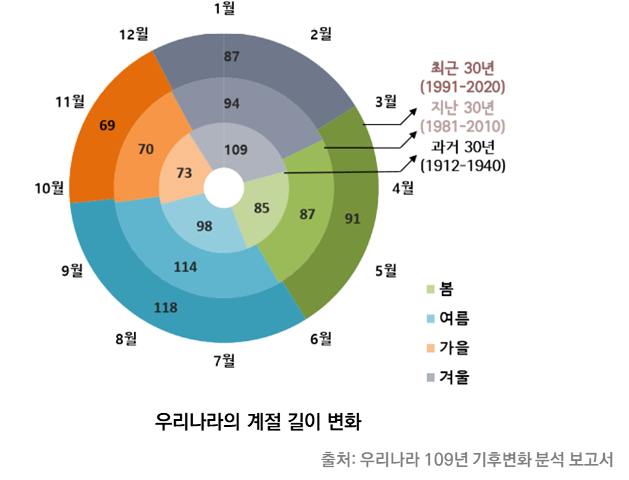 계절 변화도 뚜렷하게 나타납니다. 과거 30년(1912~1940년)에 비해 최근 30년(1991~2020년)에는 여름이 20일 길어지고, 겨울은 22일 짧아졌습니다. 아래 그림은 과거부터 최근까지 30년 단위로 계절 길이가 어떻게 변화했는지를 보여주는데요, 파란색 부분인 여름이 과거 30년에는 98일이었다가 최근 30년에는 118일이 됐습니다. 반면 회색인 겨울은 과거 30년에 109일이었다가 최근 30년에는 87일이 됐죠. 과거엔 사계절 중 겨울이 가장 길었는데, 최근에 여름이 가장 긴 계절이 되어버렸습니다. 앞으로 온난화가 더 심해지면 여름은 더 길어질 수 있습니다.