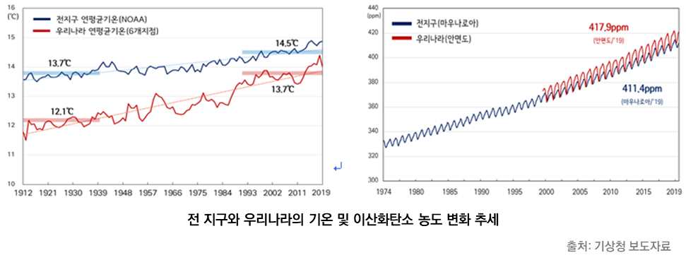 전 세계 평균과 비교하면 우리나라의 기온과 이산화탄소 농도는 어느 정도인 걸까요? 1912~2019년 사이 전 지구 평균이 0.8℃ 오를 동안 우리나라는 1.6℃ 올라서 더 높은 상승치를 보였습니다. 2019년의 이산화탄소 농도는 전 지구가 411.4ppm인데 비해 우리나라는 417.9ppm으로 6.6ppm 더 높죠. 그만큼 우리나라의 온난화와 도시화가 전 지구 평균보다 빠르게 진행되고 있음을 알 수 있습니다.