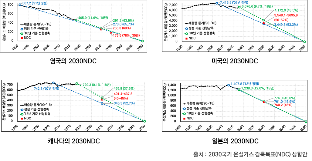 파리협정에 따라 모든 나라들은 각국의 온실가스 배출이 가장 많은 시점을 기준으로 해서, 앞으로 얼마만큼 줄이겠다는 목표를 설정합니다. 2030NDC의 경우, 산업이 일찍 발달한 영국은 1991년을 기준으로 68% 감축을 목표로 삼았습니다. 미국은 2007년을 기준으로 51%를, 캐나다 역시 2007년을 기준으로 43% 감축을 약속했죠. 일본은 2013년을 기준으로 46% 목표를 제출했습니다. 아래 그래프 중 2030년 위치에 있는 붉은색 점과 숫자가 각국의 2030NDC입니다.