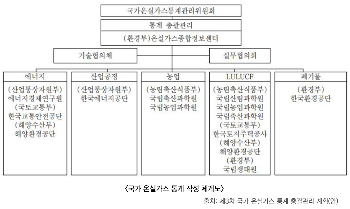 온실가스 감축 정책을 제대로 추진하려면 현황을 정확히 파악하는 것이 기본이겠죠? 온실가스는 에너지, 산업, 폐기물 등 다양한 분야에서 배출되는데, 분야별 온실가스 배출량을 다 모아서 우리나라 전체의 온실가스 배출량으로 작성합니다. 그것을 국가 온실가스 통계하고 하죠. 우리나라에서 분야별 온실가스 통계를 만드는 기관은 여러 곳이구요, 전체적으로 종합하고 검증하는 곳은 환경부의 온실가스종합정보센터(GIR)입니다.